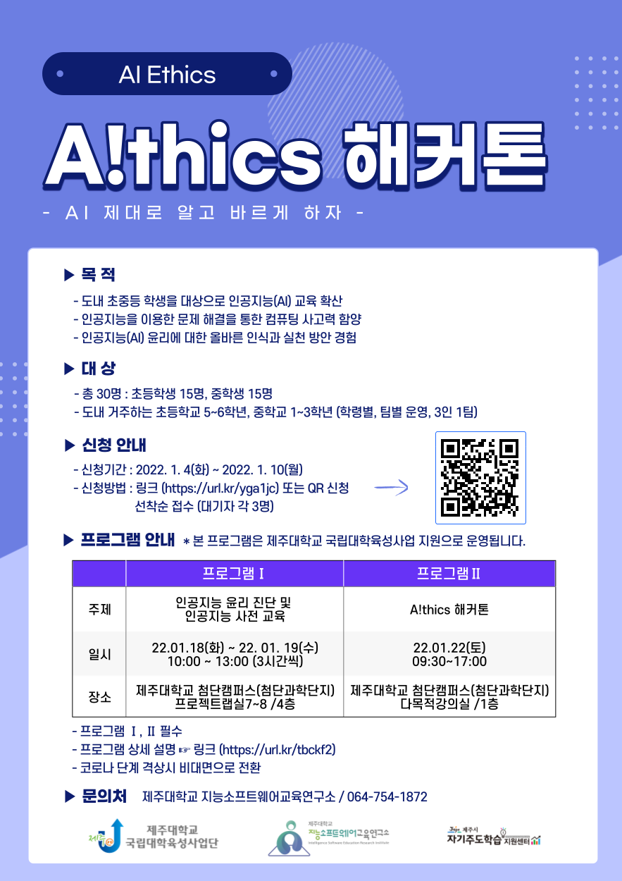 주최/주관 : 제주대학교 국립대학육성사업단, 제주대학교 지능소프트웨어교육연구소, 제주시 자기주도학습지원센터 일시 : 2022.01.18(화), 2022.01.19(수) 10:00~13:00, 2022.01.22(토) 09:30~17:00 장소 : 제주대학교 첨단캠퍼스 프로젝트랩실 7, 8 다목적강의실 |