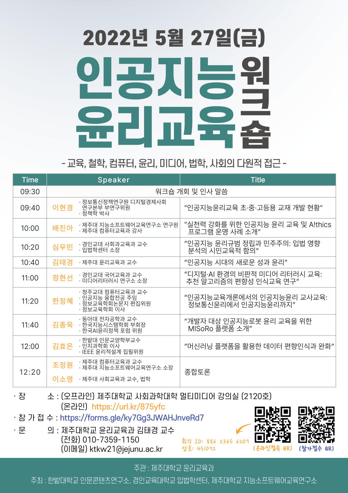 주최/주관 : 제주대학교 윤리교육과, 한밭대학교 인문콘텐츠연구소, 경인교육대학교 입법학센터, 제주대학교 지능소프트웨어교육연구소 일시 : 2022.05.27(금) 09:30~13:00 장소 : (오프라인) 제주대학교 사회과학대학 멀티미디어 강의실 (2120호) / (온라인) ZOOM - https://url.kr/875yfc 참가접수: 구글설문지 - https://forms.gle/ky7Gg3JWAHJnveRd7 |