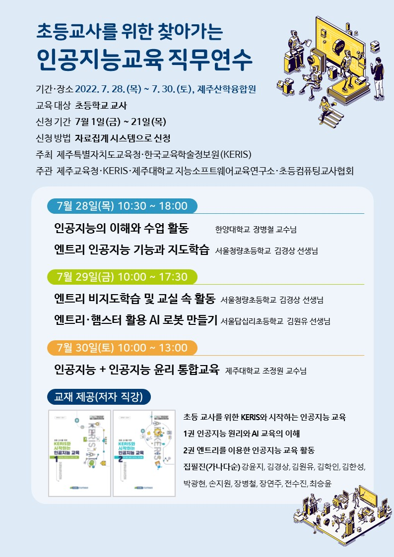 ● 공동 주관/주최 : 제주대지능소프트웨어교육연구소, 한국교육학술정보원(KERIS), 제주특별자치도교육청 ● 연수대상 : 도내 초등교사 및 제주대학교 대학원생 20명 ● 연수일시 : 총15시간 - 2022. 7. 28.(목) 10:30 ~ 18:00 - 2022. 7. 29.(금) 10:00 ~ 17:30 - 2022. 7. 30.(토) 10:00 ~ 13:00 ● 연수장소: 제주산학융합원(제주시 첨단로 8길 40) ● 연수과정 : 붙임 참조 ● 신청안내 : - (신청방법) 도교육청 홈페이지 → 교직원용 → 연수공유방 → 특수분야연수 → 연수신청 - (신청 url) https://www.jje.go.kr/board/list.jje?boardId=BBS_0000457&menuCd=DOM_000001402003001000 - (신청기한) 2022. 7. 21. (목) ● 대상자 발표: 2022. 7. 21. (목) 소속 학교로 공문 발송 |